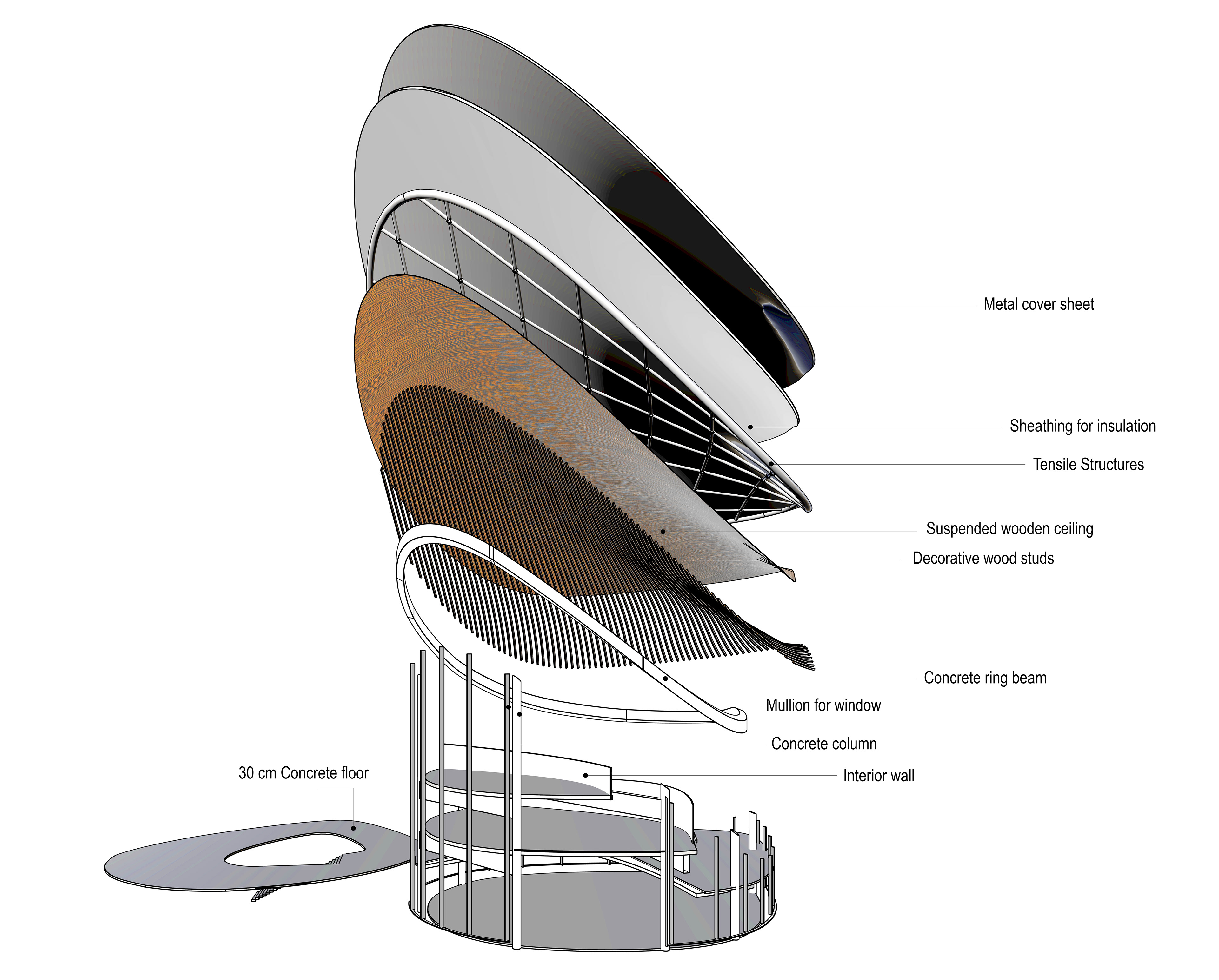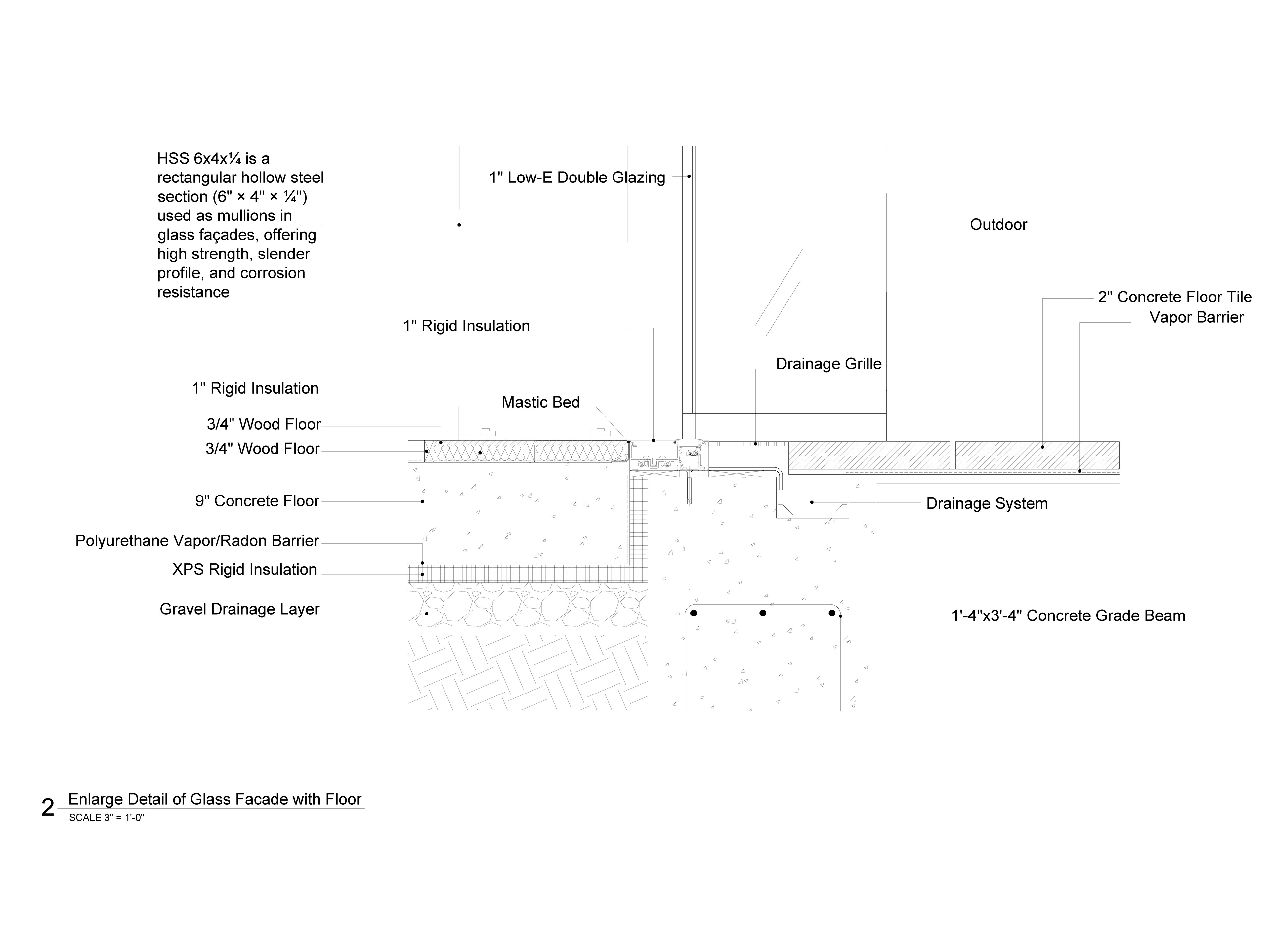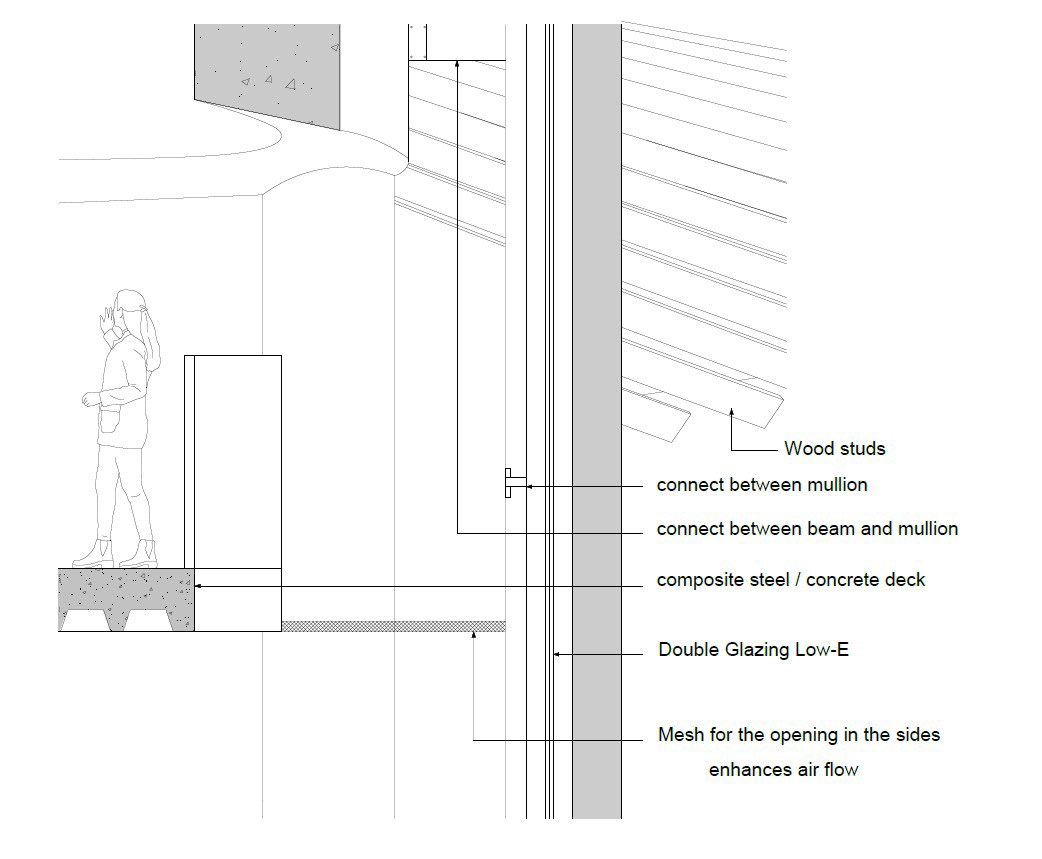 In the upper floors, a 2-foot gap is maintained between the floor slab and the building’s glass façade. This design decision helps prevent direct structural pressure or thermal bridging on the glass system, enhancing its performance and longevity. Additionally, the gap promotes better natural air circulation between floors, contributing to the building’s passive ventilation strategy. For safety, the space is fully covered with a concealed metal mesh, ensuring protection without compromising the clean architectural appearance.