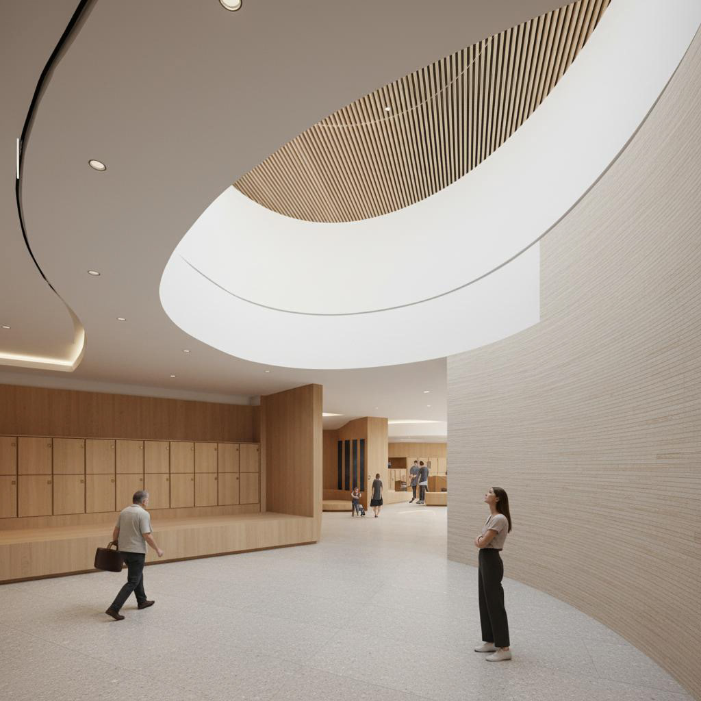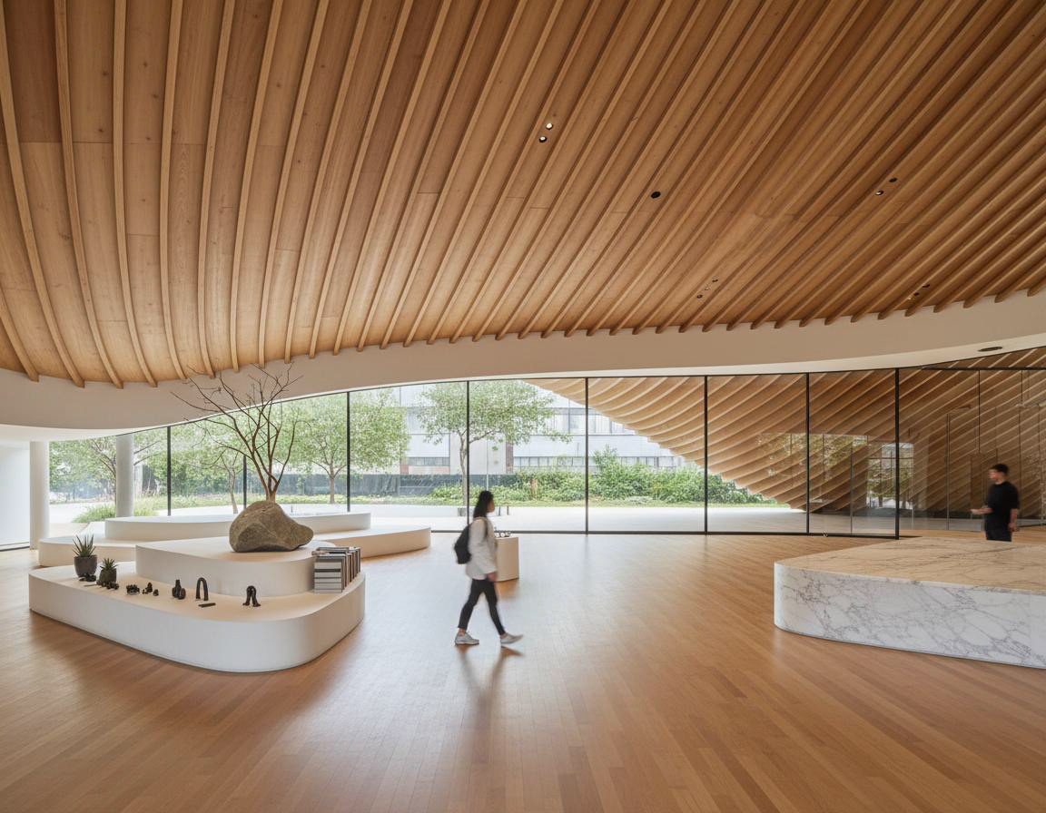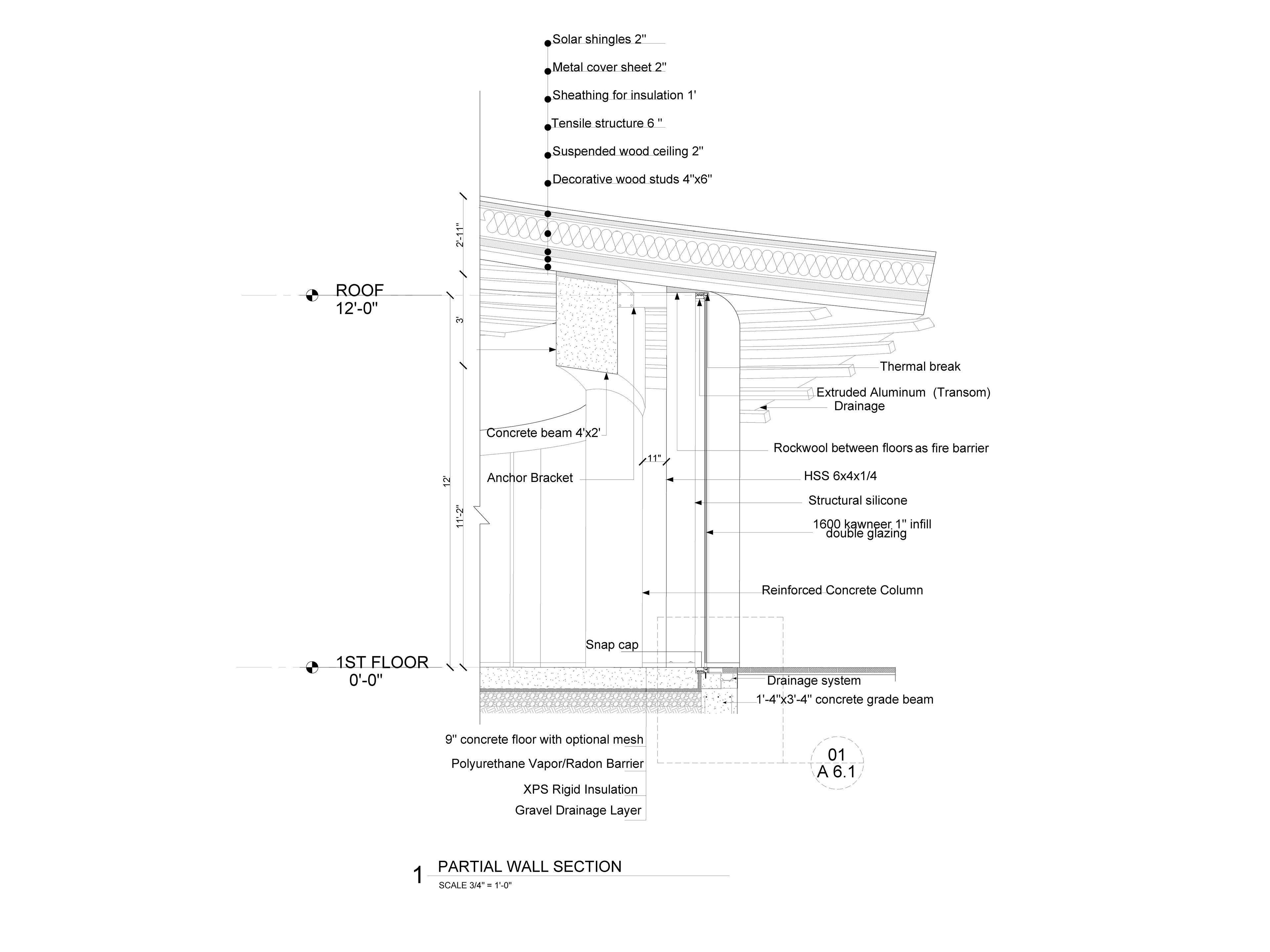 In the upper floors, a 2-foot gap is maintained between the floor slab and the building’s glass façade. This design decision helps prevent direct structural pressure or thermal bridging on the glass system, enhancing its performance and longevity. Additionally, the gap promotes better natural air circulation between floors, contributing to the building’s passive ventilation strategy. For safety, the space is fully covered with a concealed metal mesh, ensuring protection without compromising the clean architectural appearance.