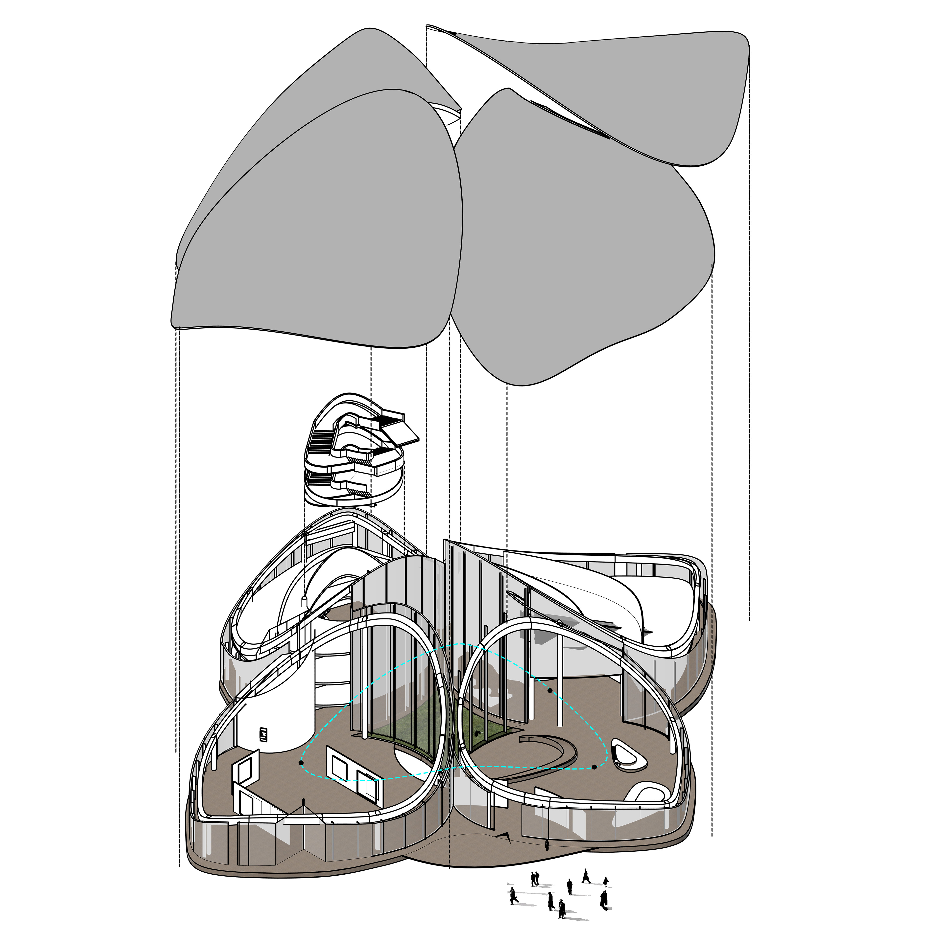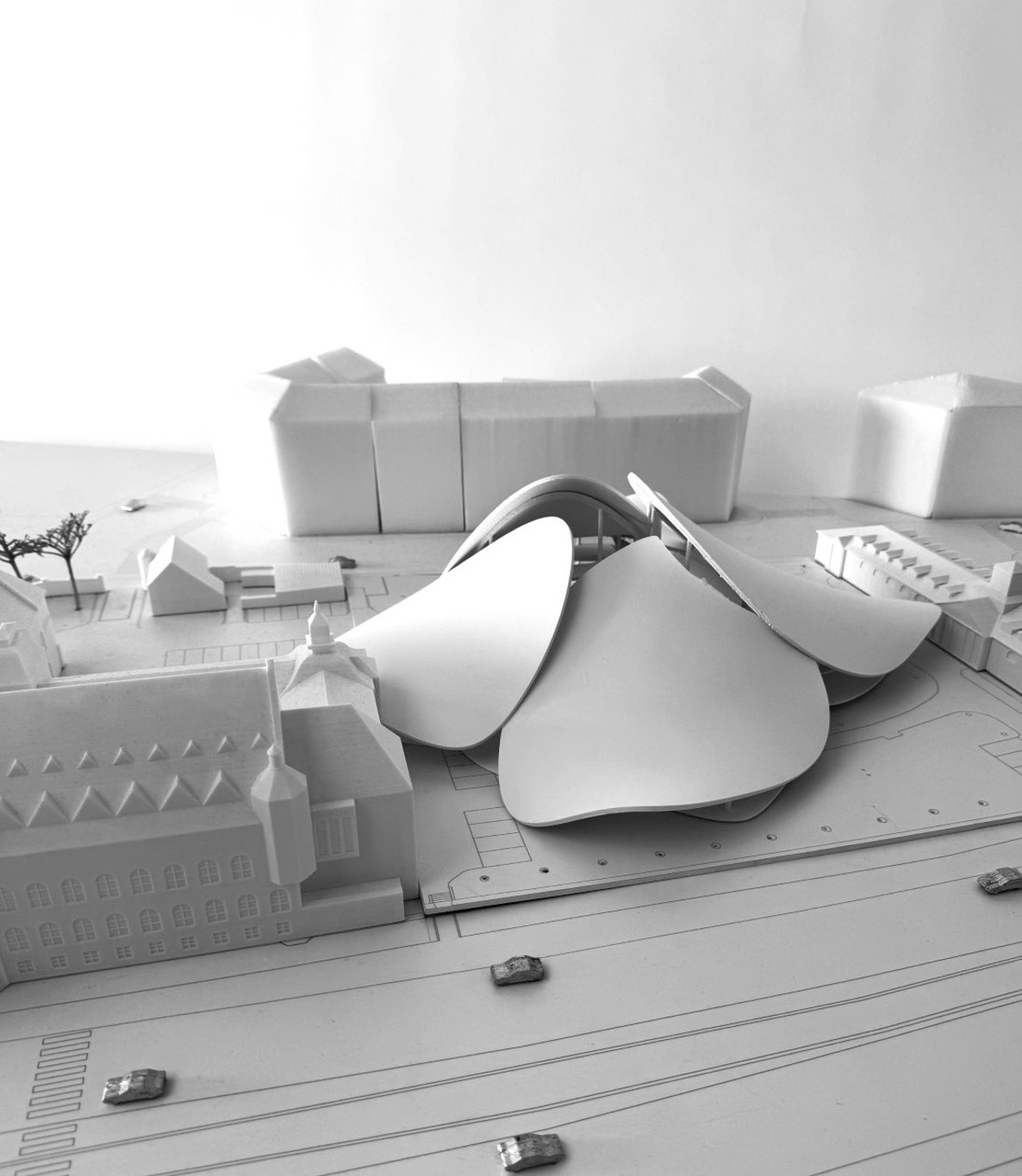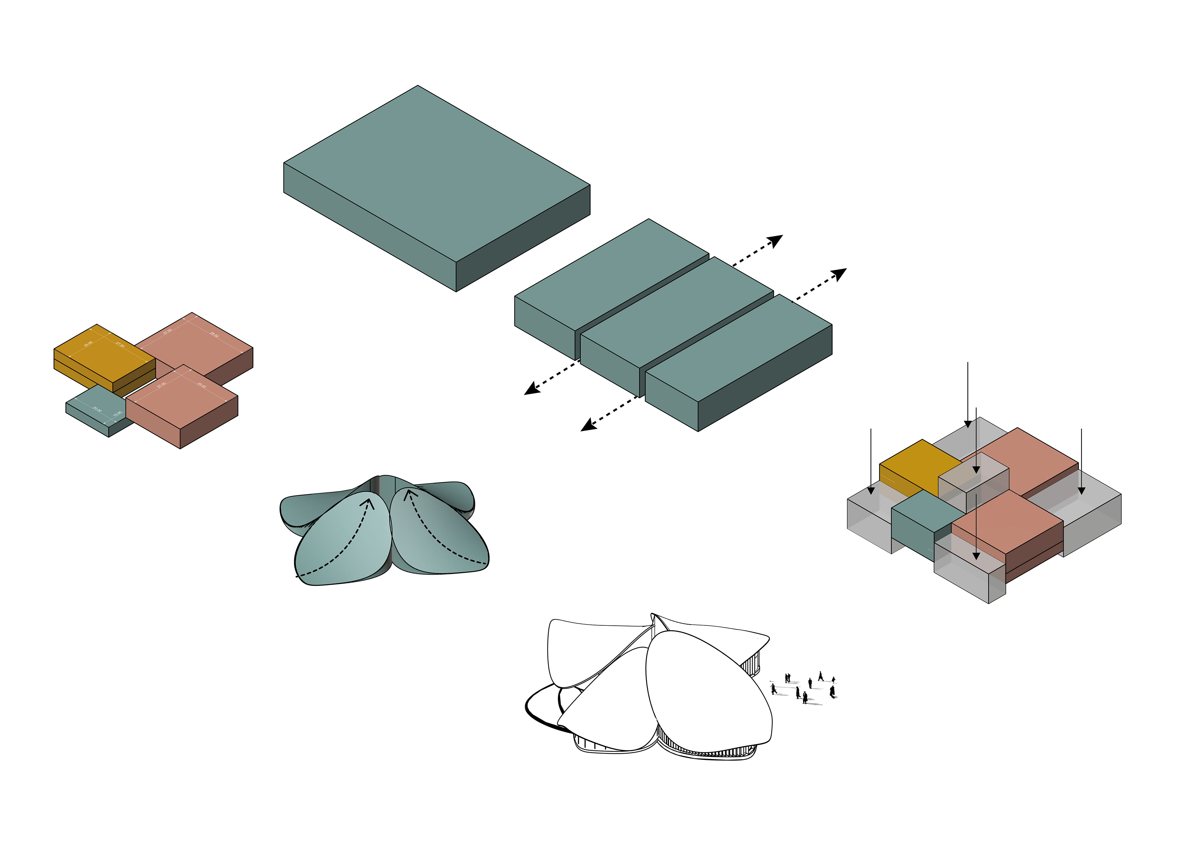 The design started with a 3D model focused on organizing the required spaces and program. Inspired by nearby buildings with internal courtyards, the new museum features a central courtyard surrounded by four main volumes: two for exhibitions, one for the main entrance, and one for services. A basement level supports additional service functions.