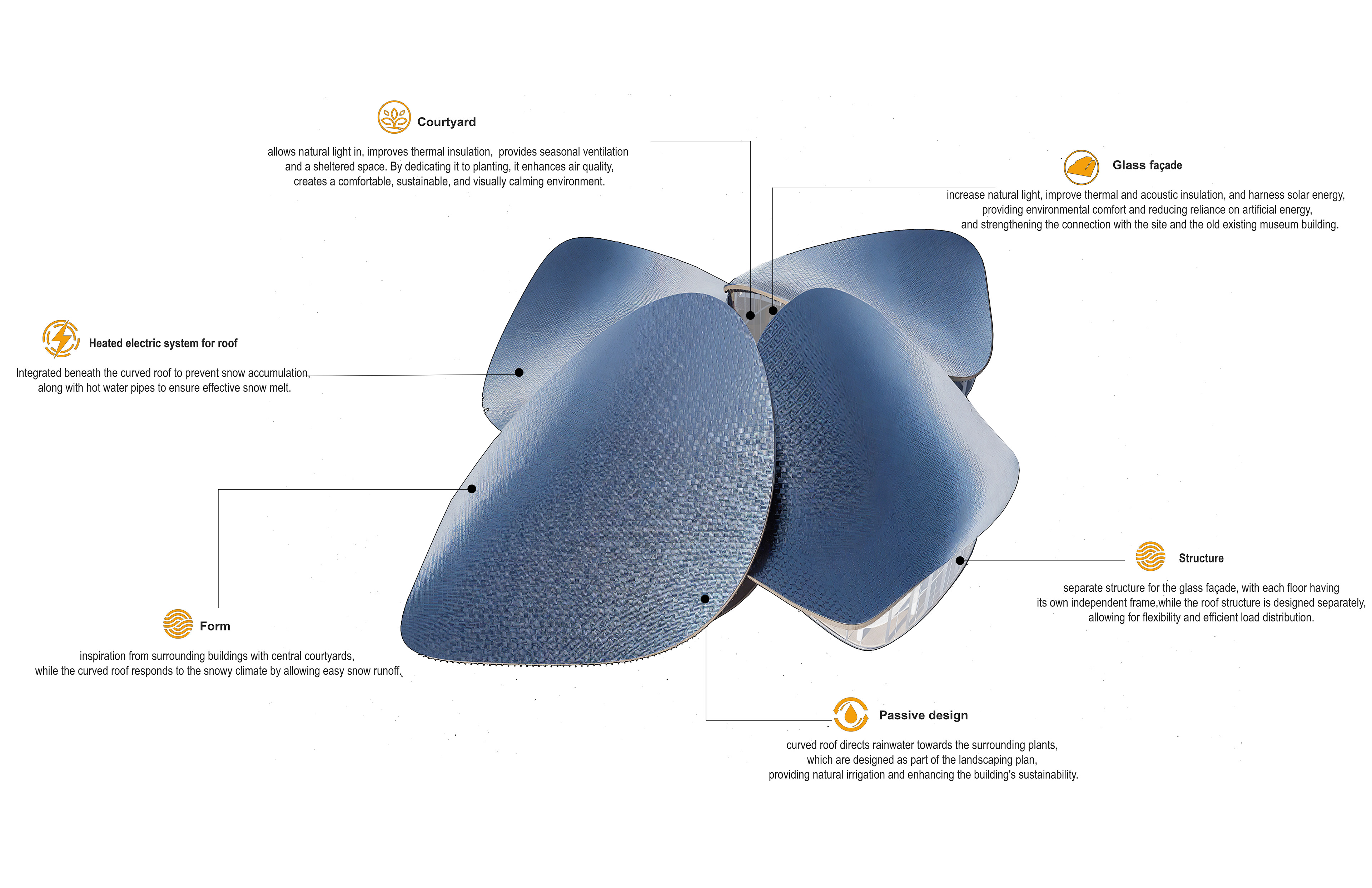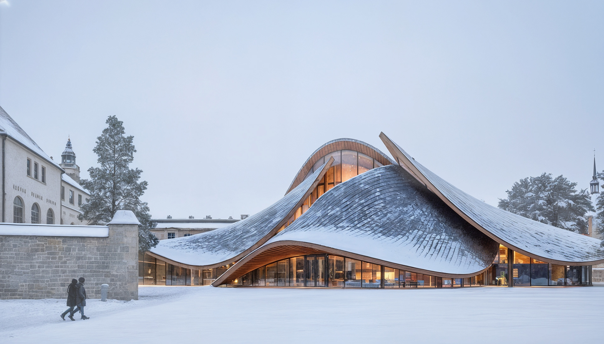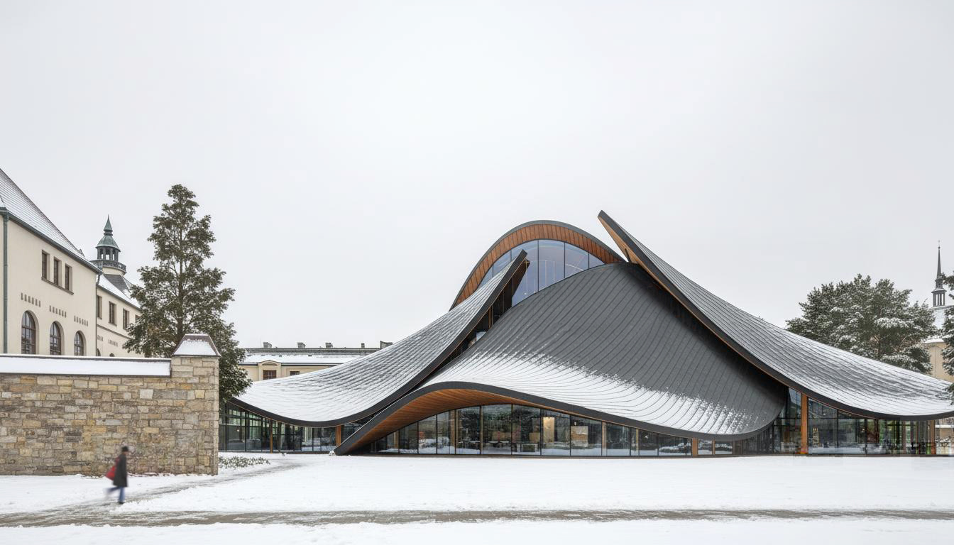 The sloped roof supports snow drainage and highlights the building’s modern geometry, creating a distinct yet harmonious extension to the historic museum.