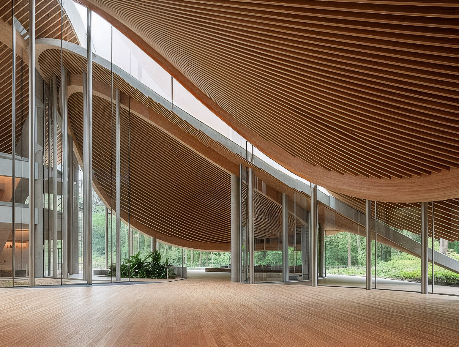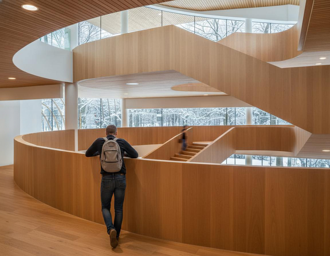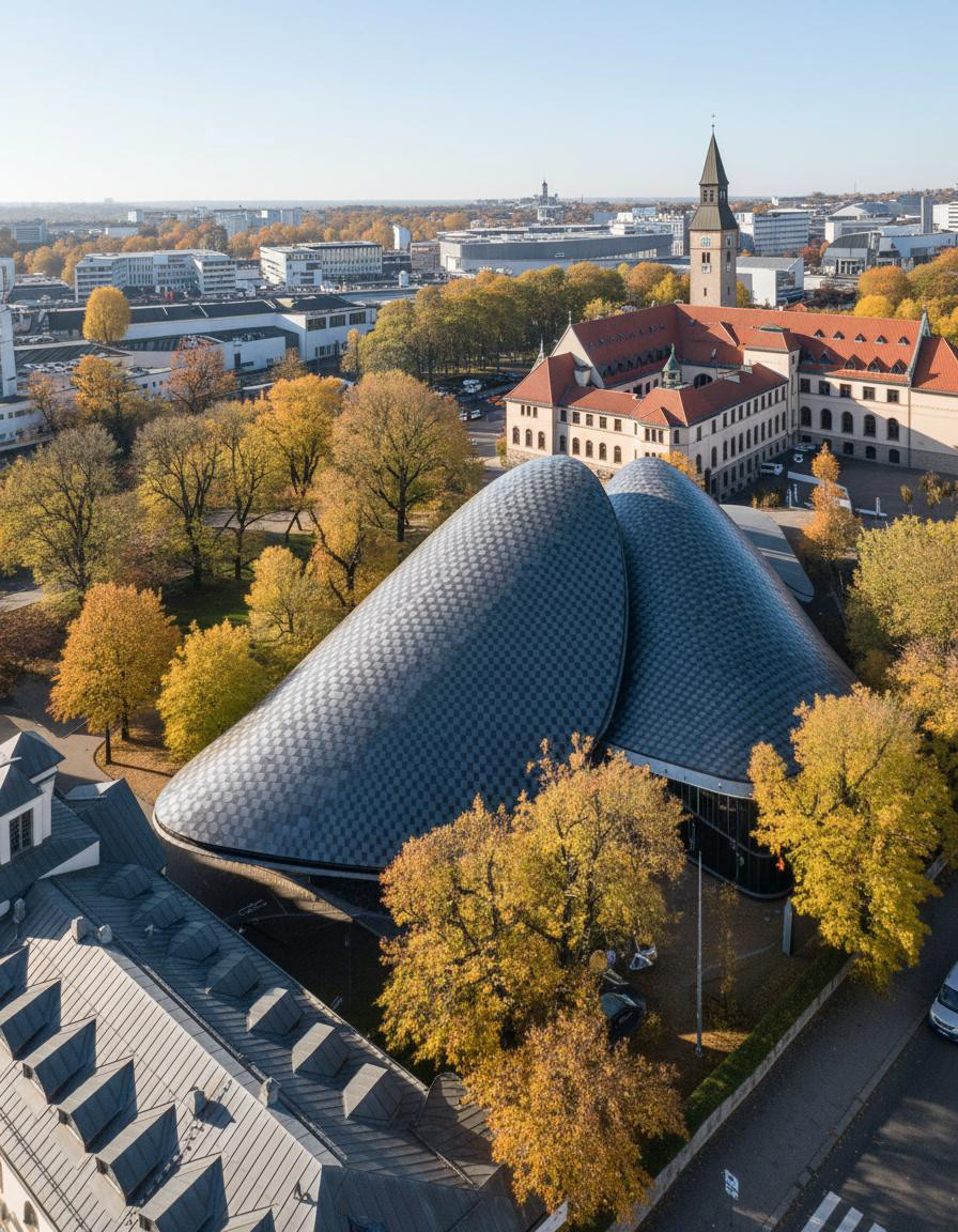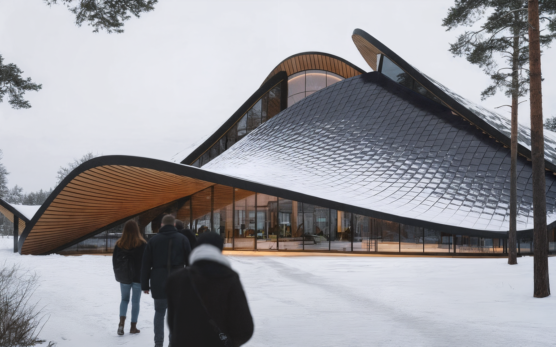 The sloped roof supports snow drainage and highlights the building’s modern geometry, creating a distinct yet harmonious extension to the historic museum.
