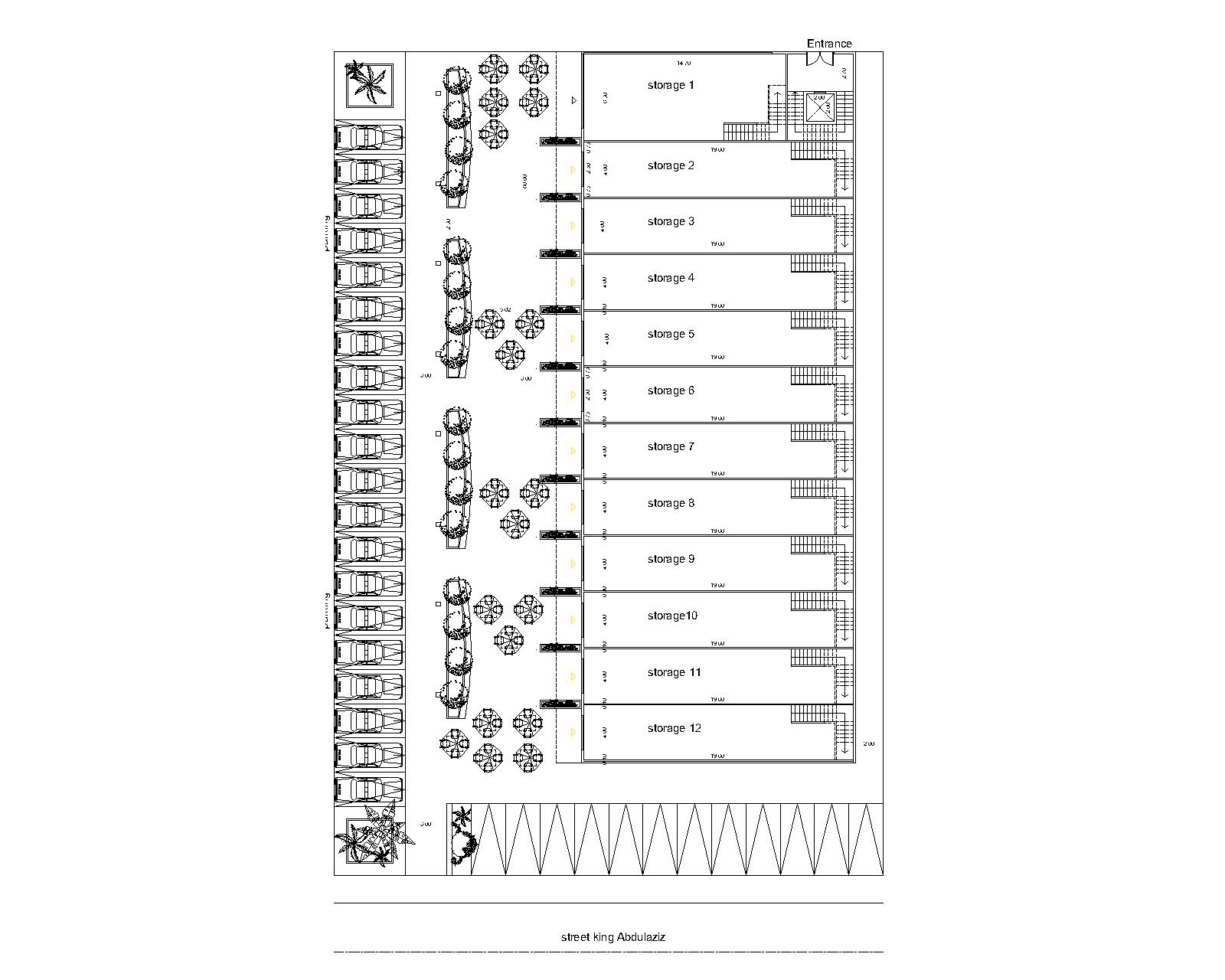 This project is a two-story commercial warehouse development designed in Riyadh, Saudi Arabia. The ground floor includes 12 storage units, organized for efficient loading and circulation, while the mezzanine level provides additional storage space to support the businesses operating within the facility. The second floor is designed as a suite of administrative offices, offering flexible layouts and natural lighting to create a comfortable working environment. The project also features outdoor seating areas and a pedestrian walkway, creating pleasant public spaces that support user comfort and encourage activity around the building.