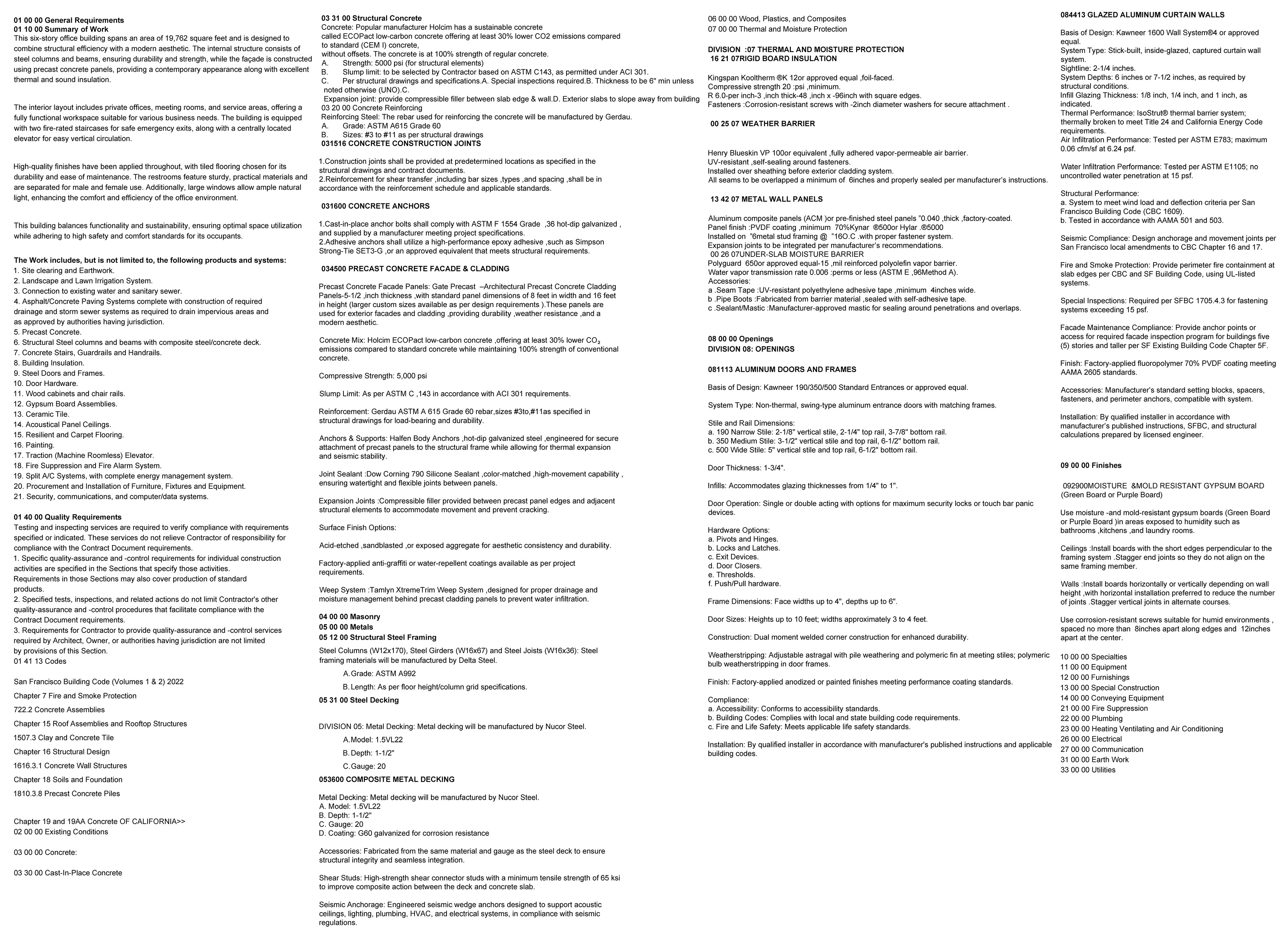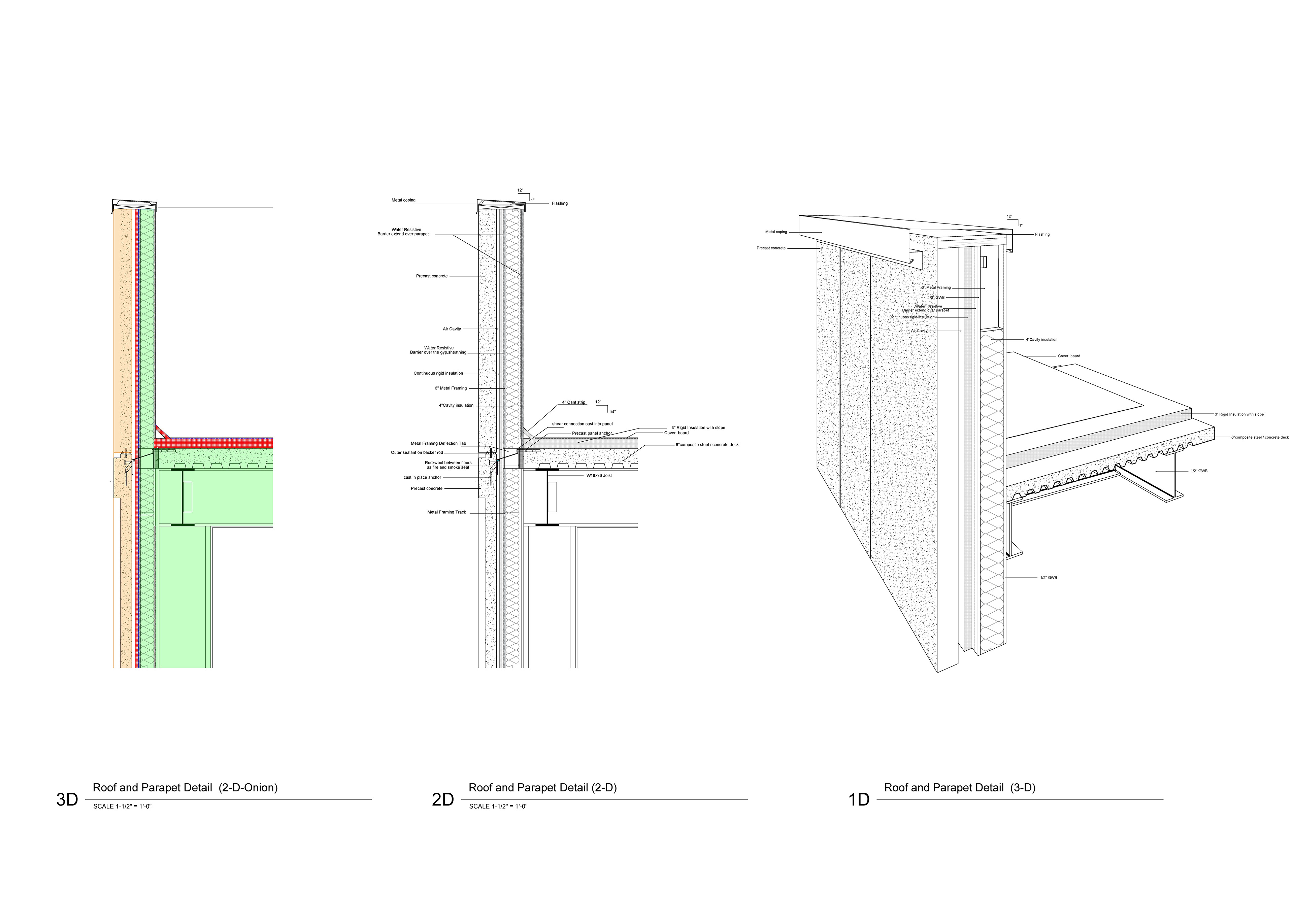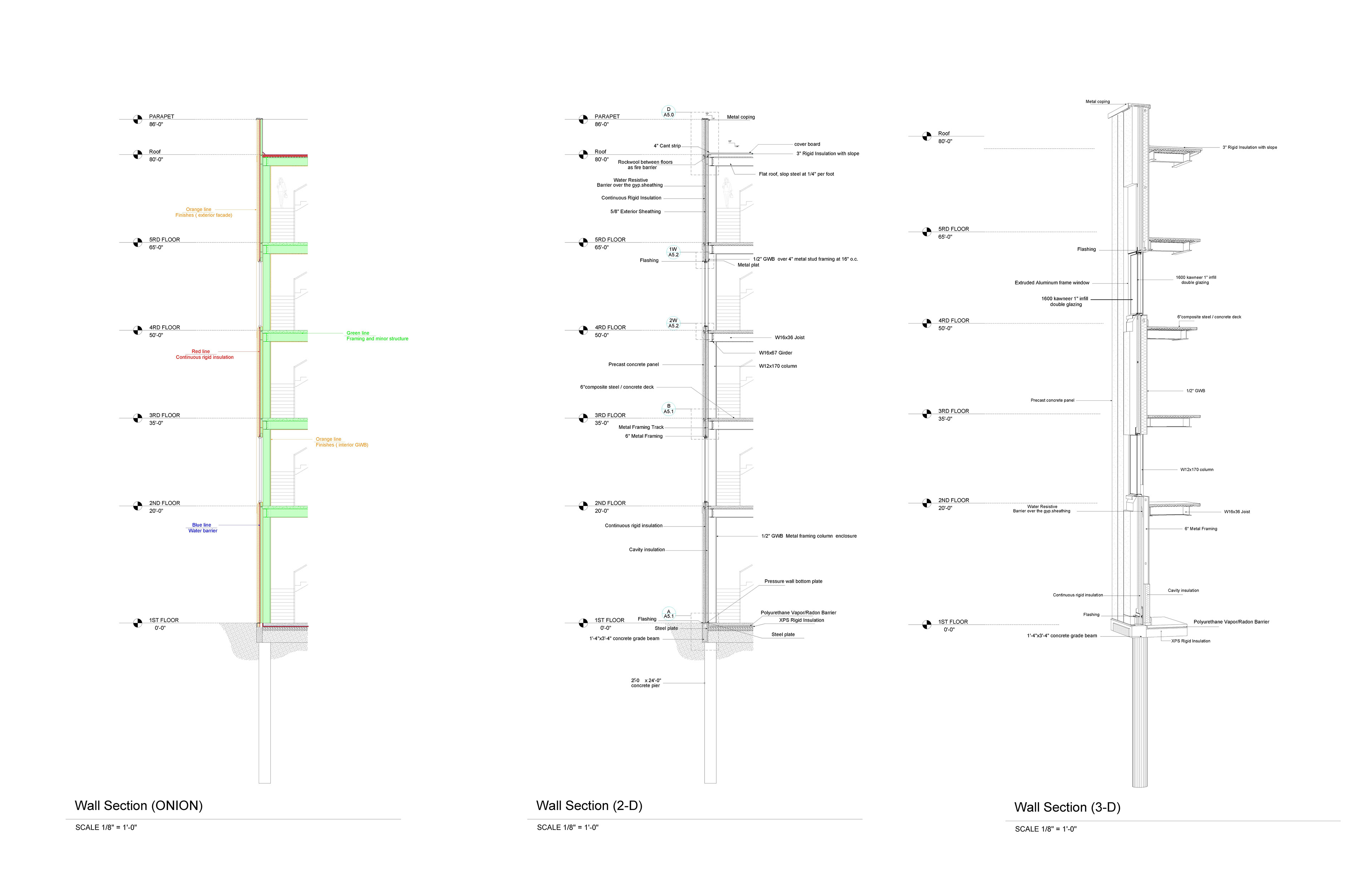 connections, and transitions. This section clearly communicates the functional layering of the envelope from the structural components to the exterior finishes. The project was completed in alignment with California Building Codes, with strong emphasis on materials, façade systems, enclosure strategies, and construction documentation. The scope of work included drafting detailed specifications, analyzing multiple façade assemblies, and producing precise 2D and 3D representations of key construction elements.