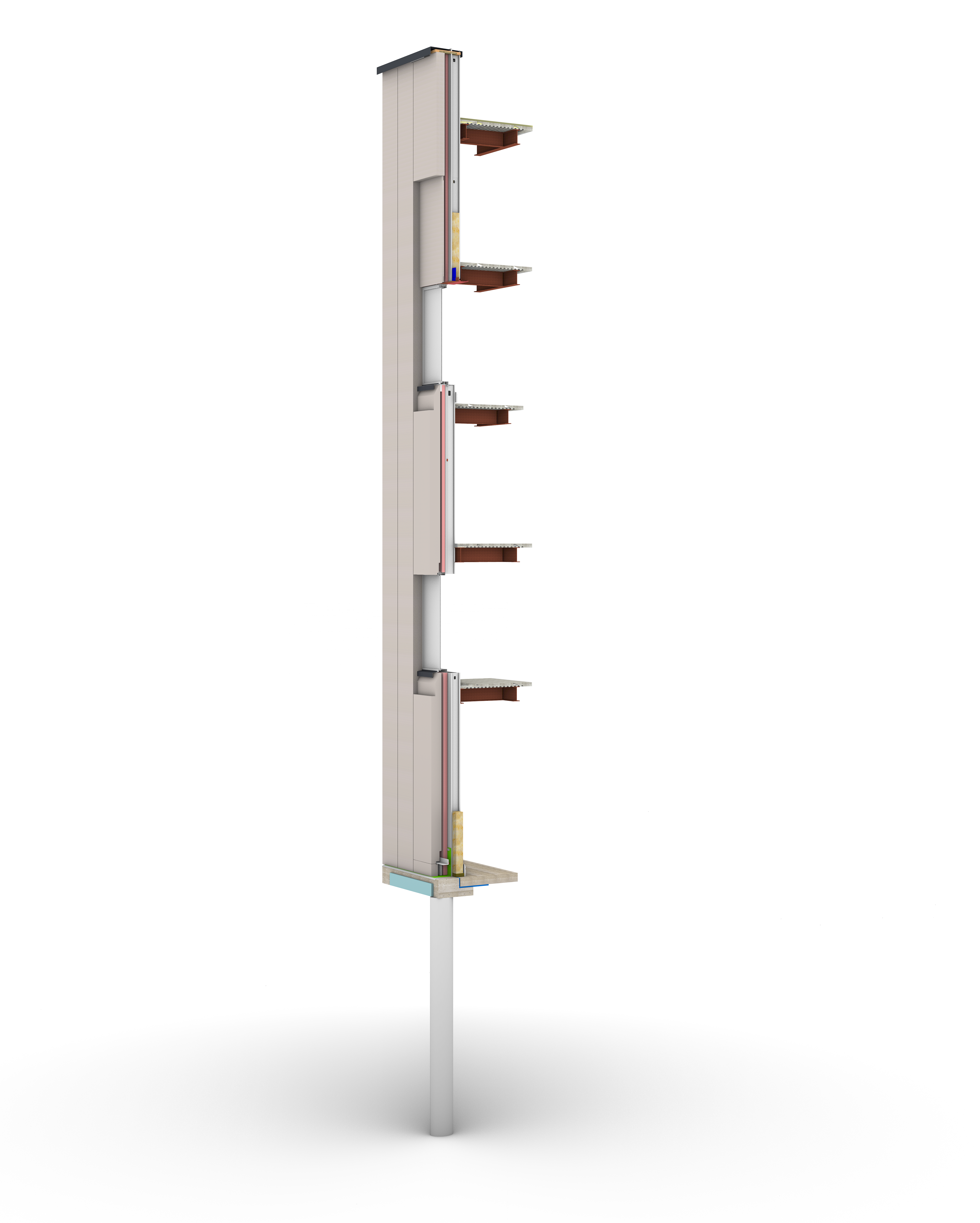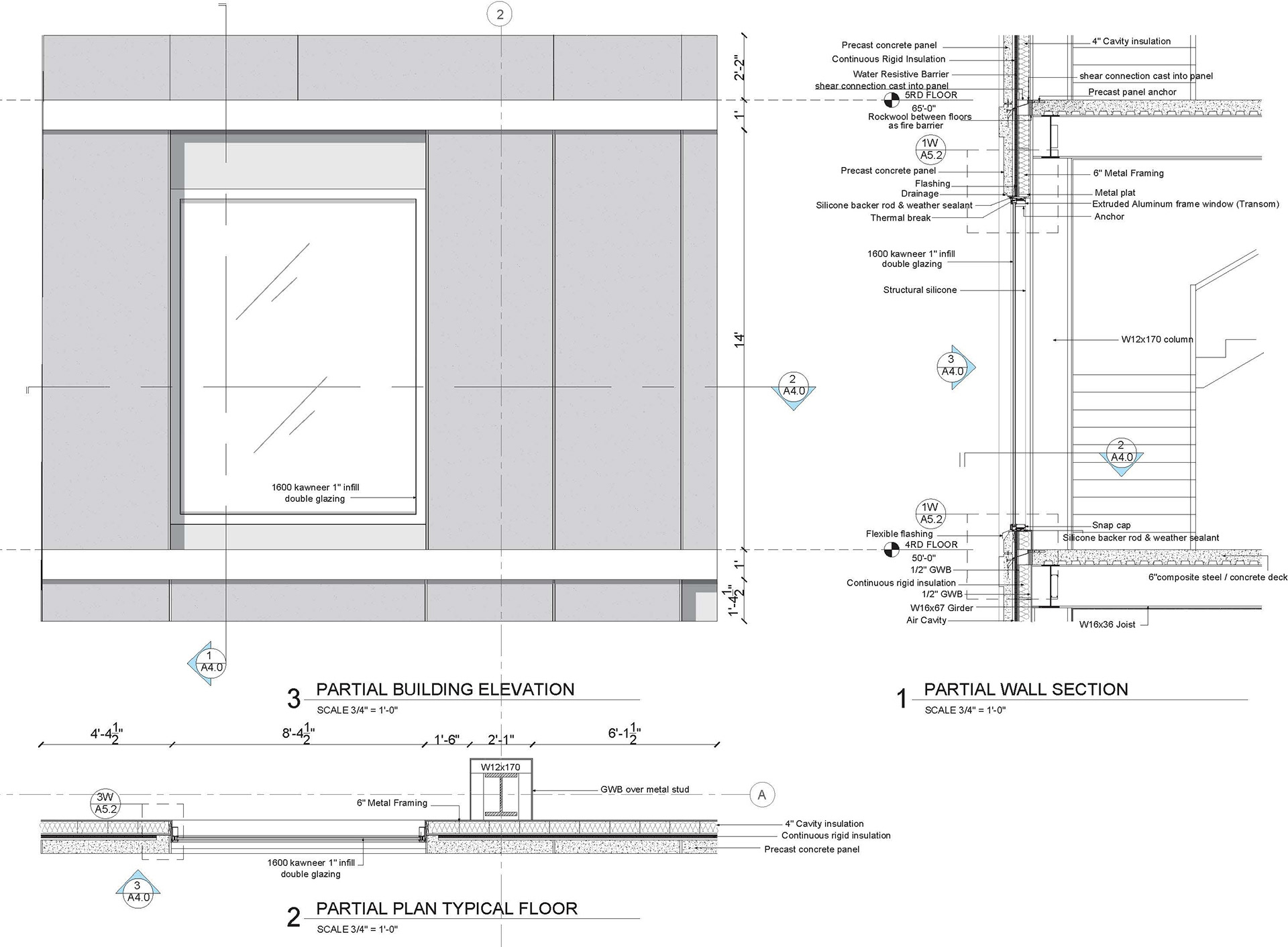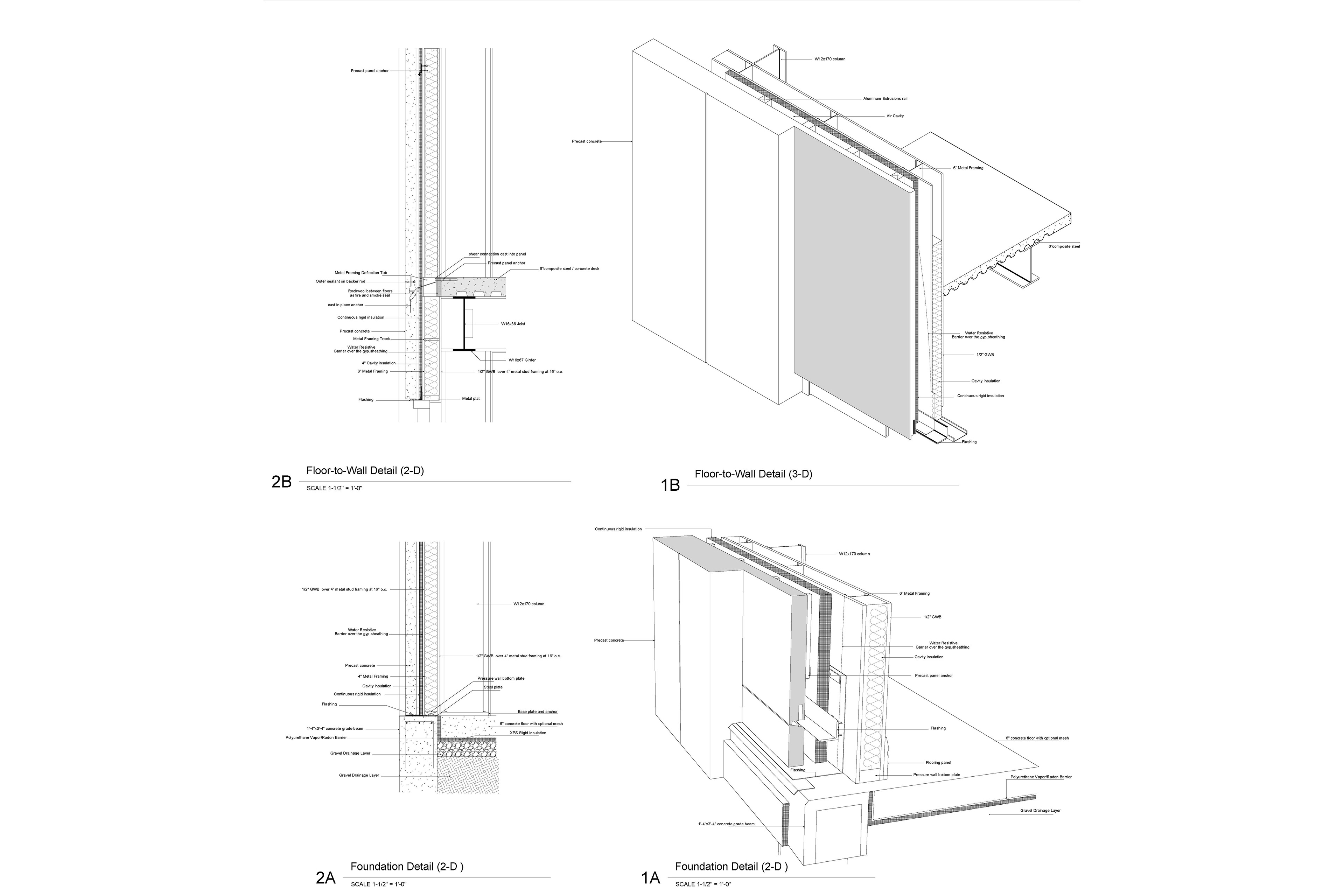 The technical detailing focused specifically on a precast concrete wall system supported by a steel structural frame, including thermal and waterproofing layers, connection methods, and performance considerations.