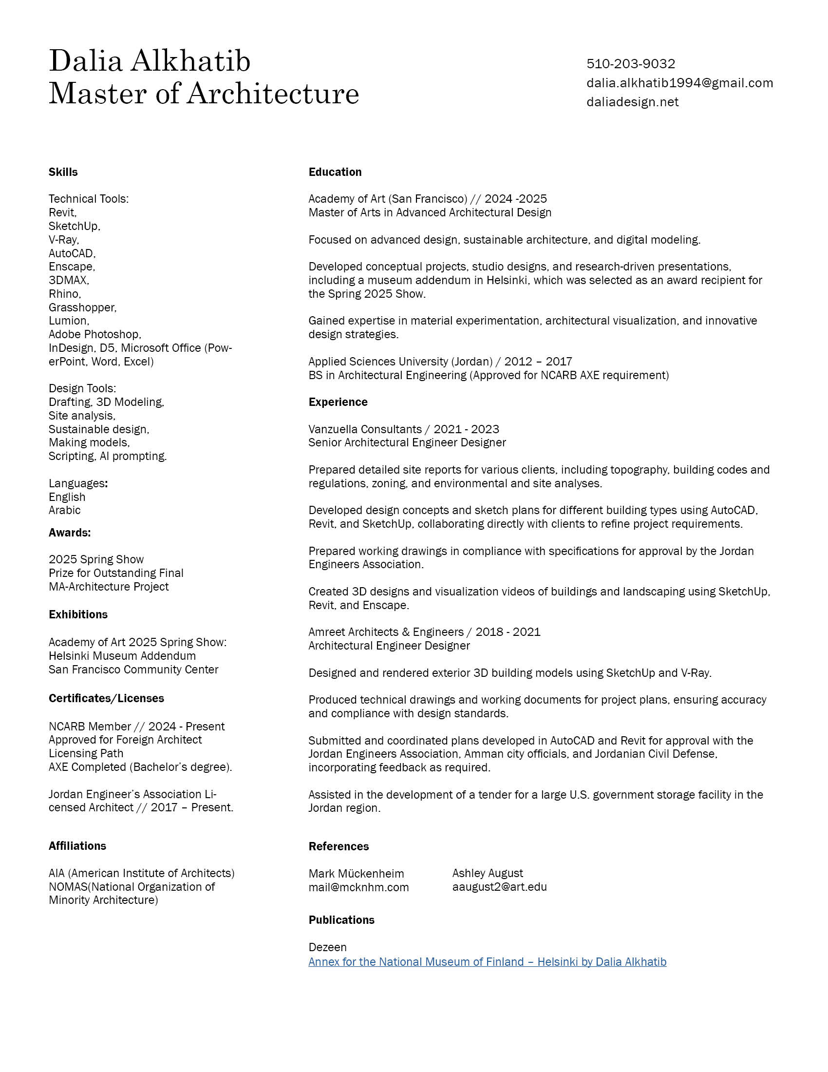 As an architect, I approach every project with intention—balancing concept, function, and aesthetics to create meaningful spaces. I’m constantly evolving, challenging myself, and refining my design voice. I explore form, light, and materiality to communicate ideas clearly and to develop thoughtful, innovative architectural solutions from multiple perspectives.